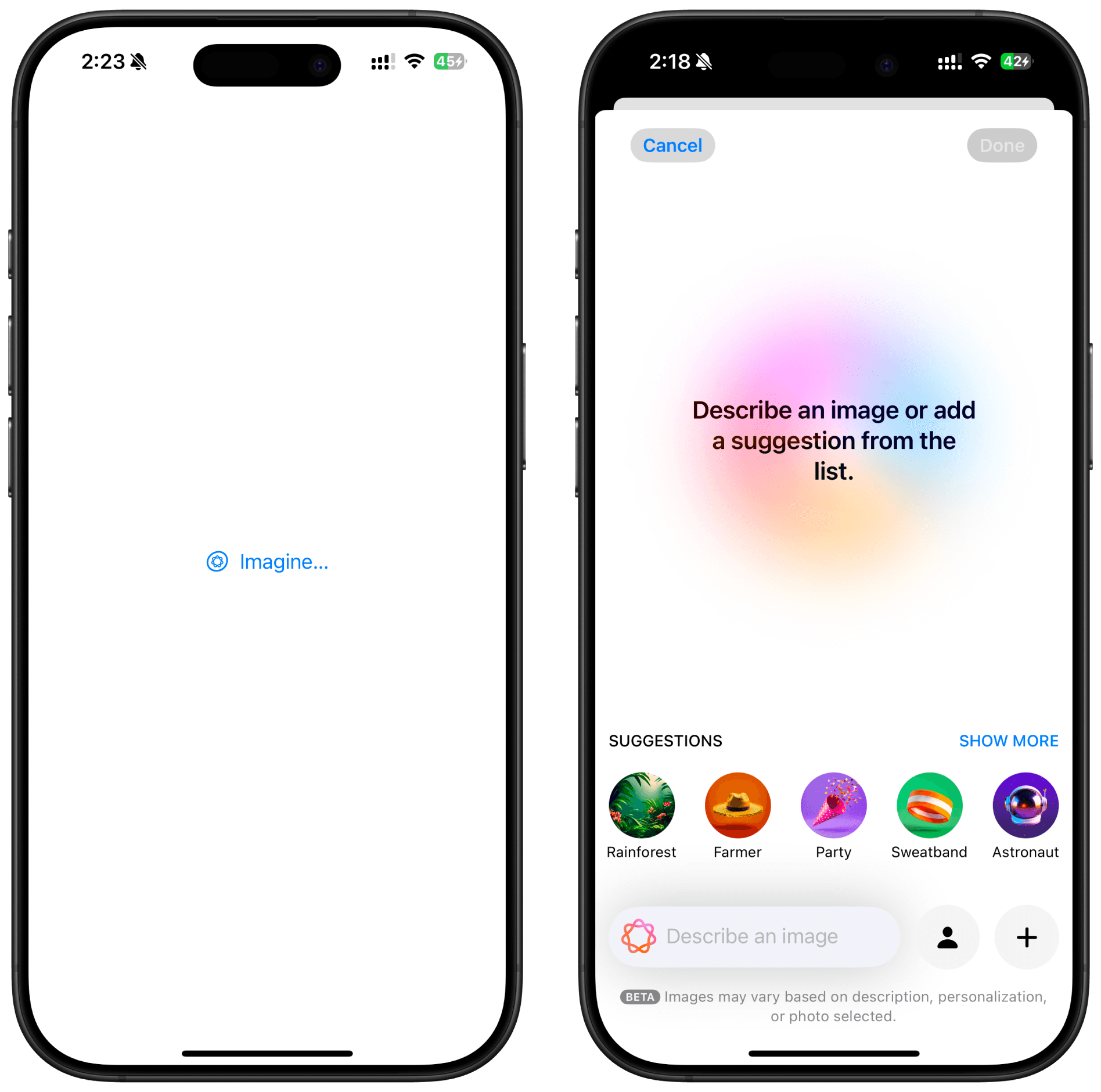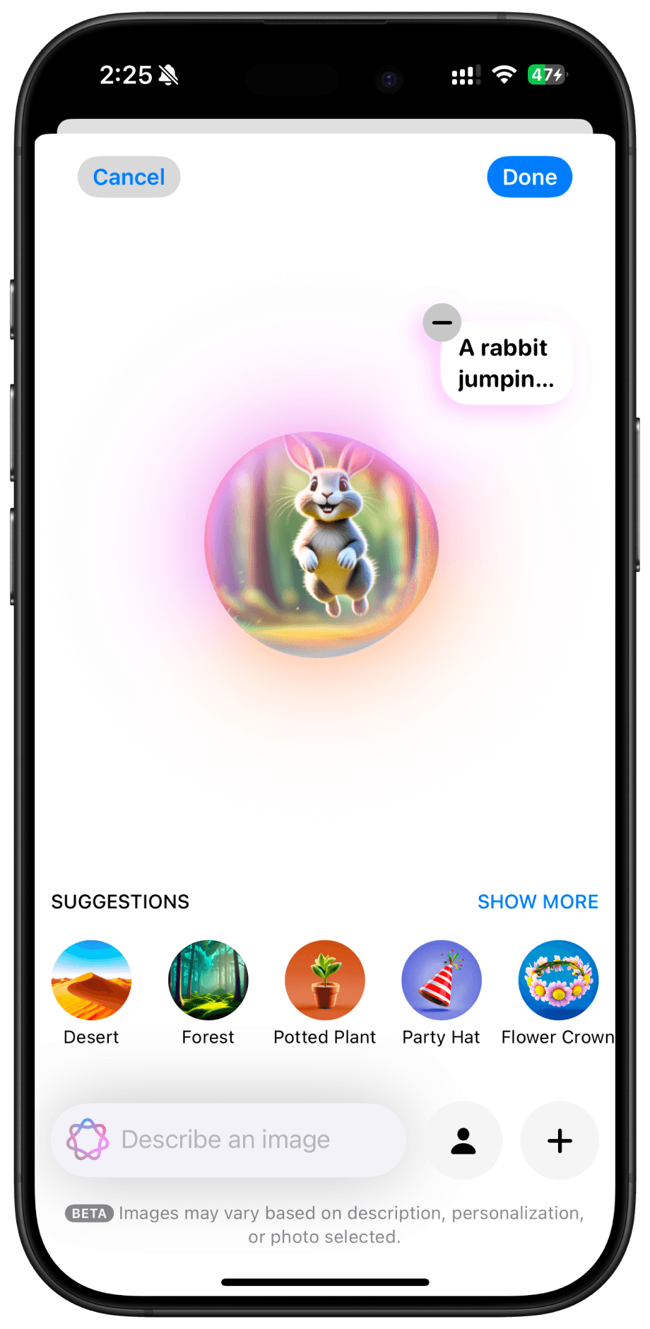 Apple Intelligence features, like Image Playground, are available on iPhone 15 Pro, iPhone 15 Pro Max, or newer devices running iOS 18.2 or later.