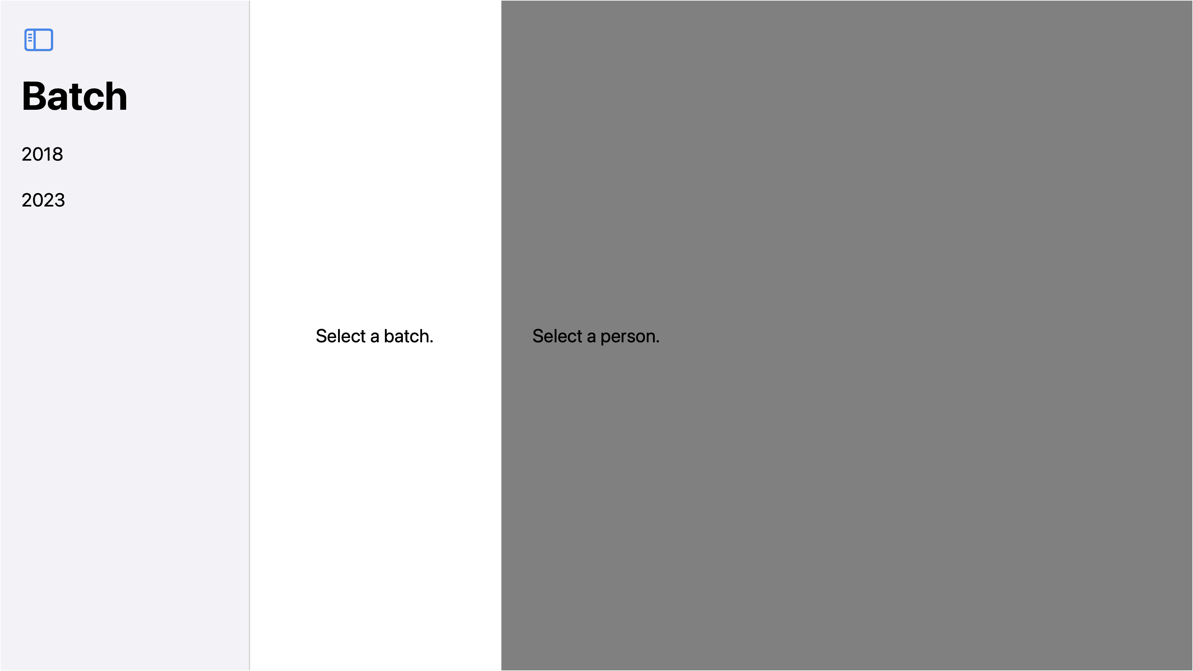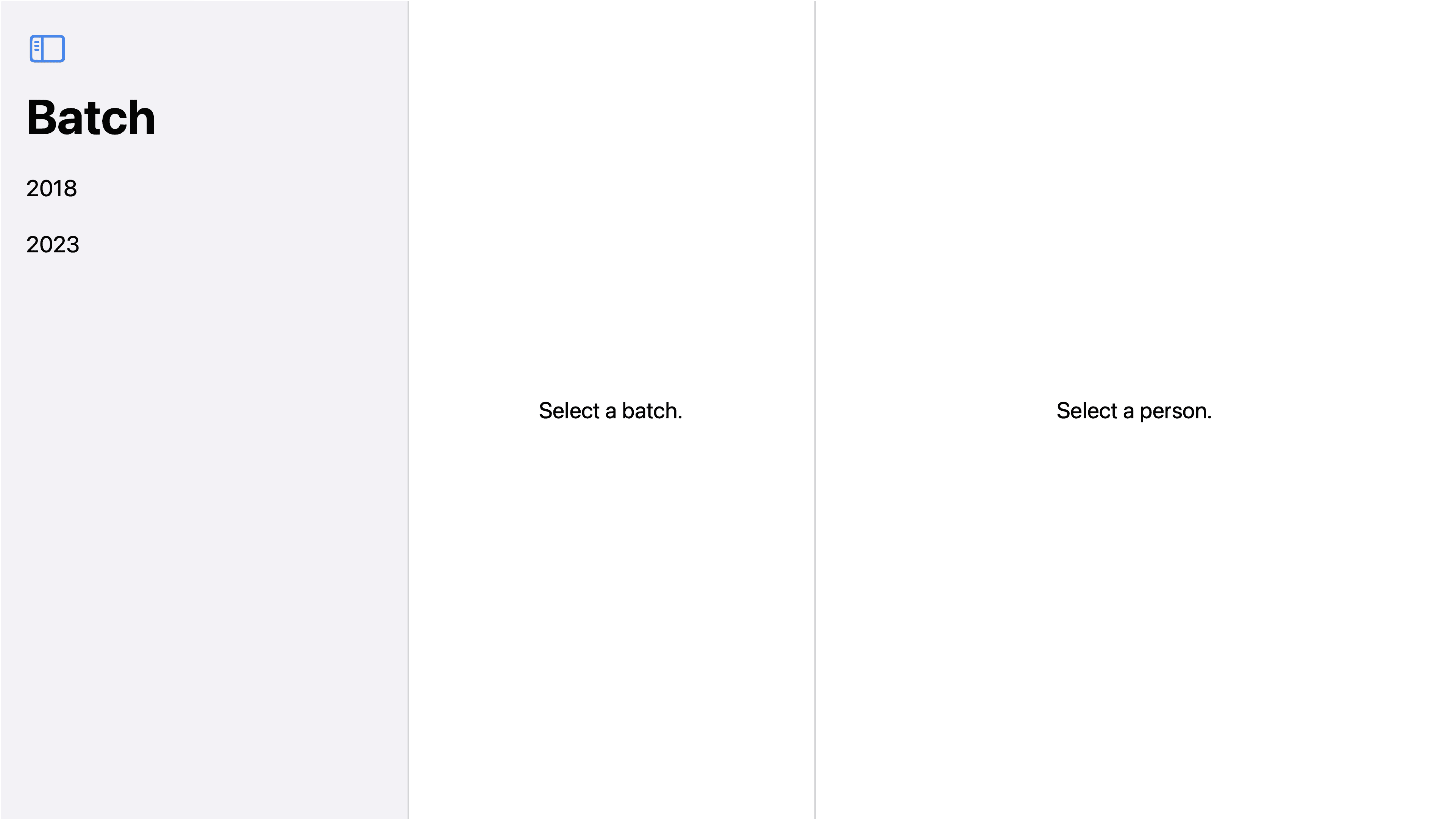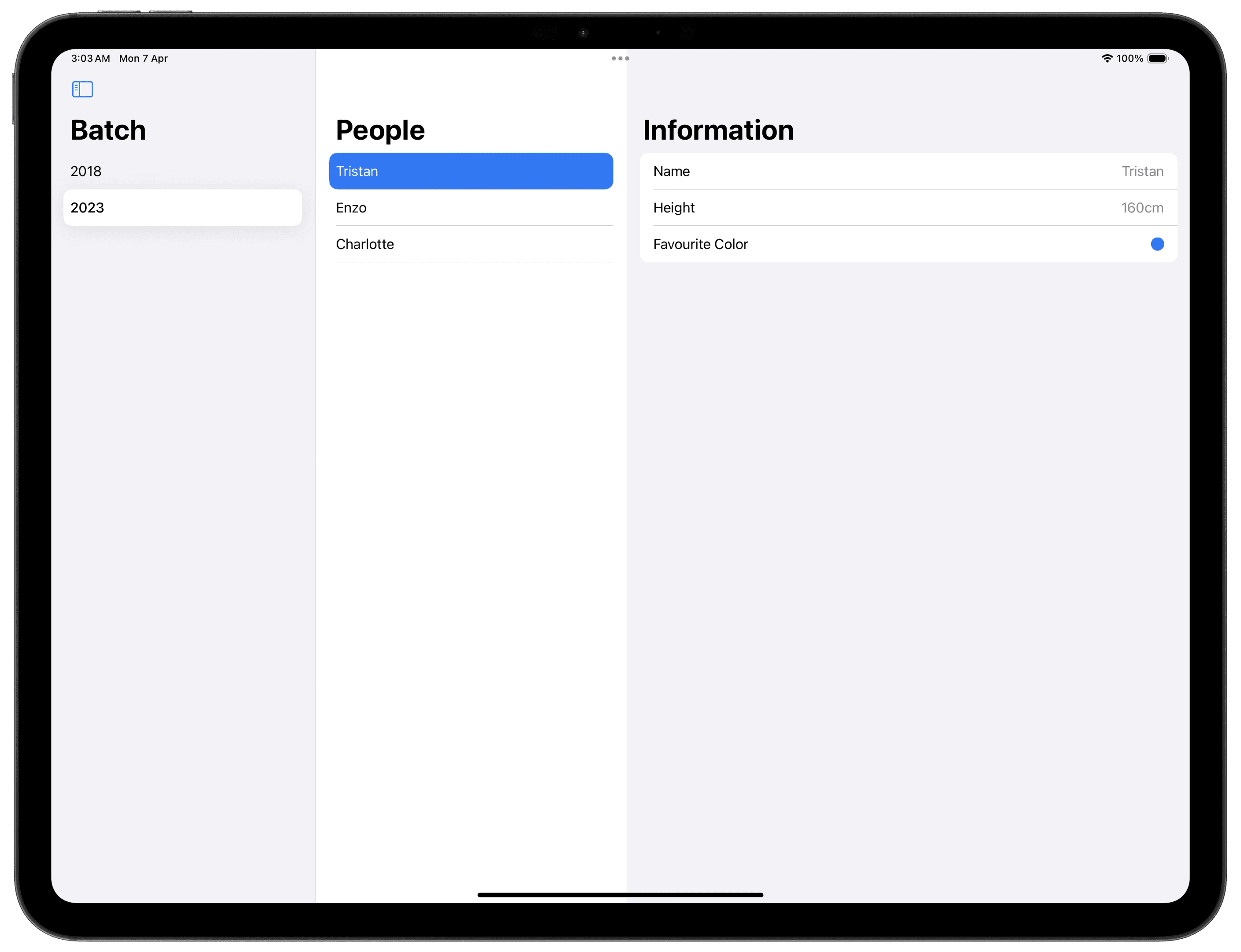 The example below shows a two column NavigationSplitView. The leading column called the sidebar, is being used to control what is being presented in the trailing column, the detail.